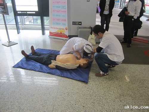演练分为两个部分,第一部分是是模拟自动扶梯客伤事故。乘客较多上下电梯拥挤,某乘客没有抓好扶手带,上下拥挤导致摔倒受伤。第二部分是模拟站内乘客突发心脏病、呼吸心跳停止的急救场景。某乘客在买票进站时,突然在售票厅晕倒,工作人员进行紧急抢救。在演练前,昆山市红十字会救护老师对伤情处置作了讲解。演练中,站务人员认真按照操作标准进行了初步救治。昆山市红十字会救护老师还向在场的人员现场演示了心肺复苏术,并作了讲解,同时还向大家传授了一些急救技巧。
