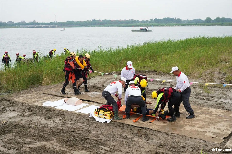 演练现场根据台风过境可能发生的3种情境设置了15个演练项目。整个演练过程在市安委办、减灾办和防汛指挥部精心组织和精密安排下,各单位分工明确、密切配合。在岸上救护环节,昆山市红十字救援队负责进行伤员救治。