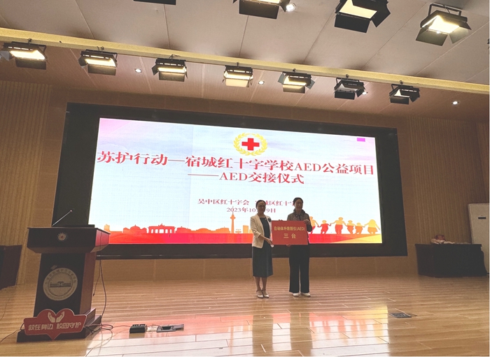 在宿城区中等专业学校,两地合作开展了“救在身边·校园守护”行动系列活动,通过举办“苏护行动——宿城红十字学校AED公益”项目启动仪式,红十字应急救护知识培训暨师资观摩教学活动等,强化项目对口帮扶,建立学习互动机制,互学互鉴、共享共赢,促进南北融合发展。