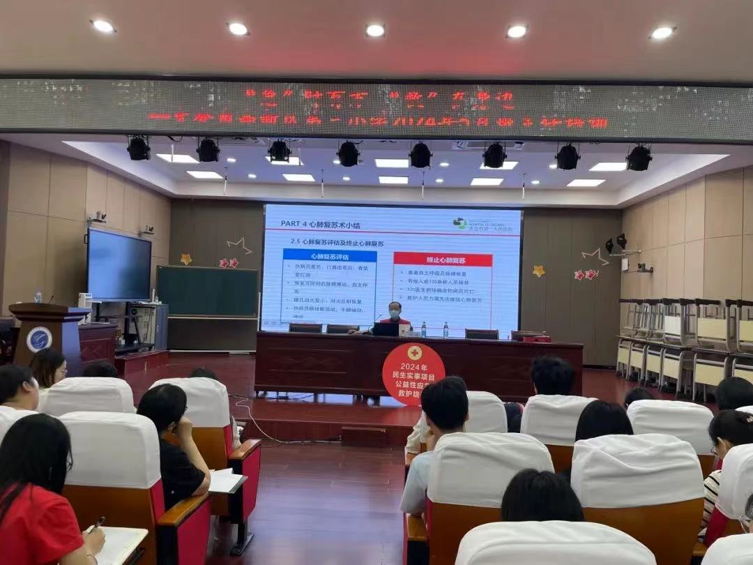 红十字救护培训师深入浅出地阐释了心肺复苏术的概念,强调“黄金4分钟”的重要性,并重点围绕心肺复苏的救护步骤和自动体外除颤器(AED)的操作使用进行了系统、详尽的讲解。
