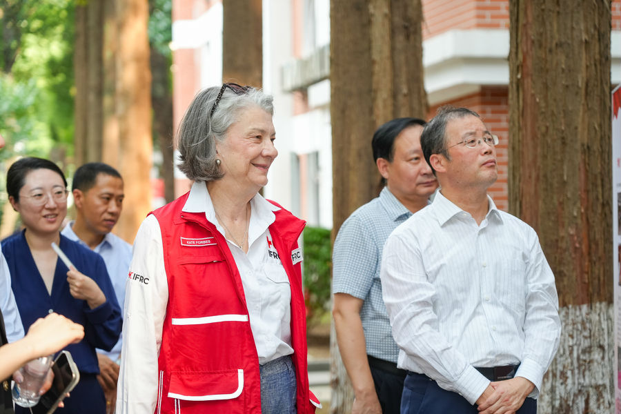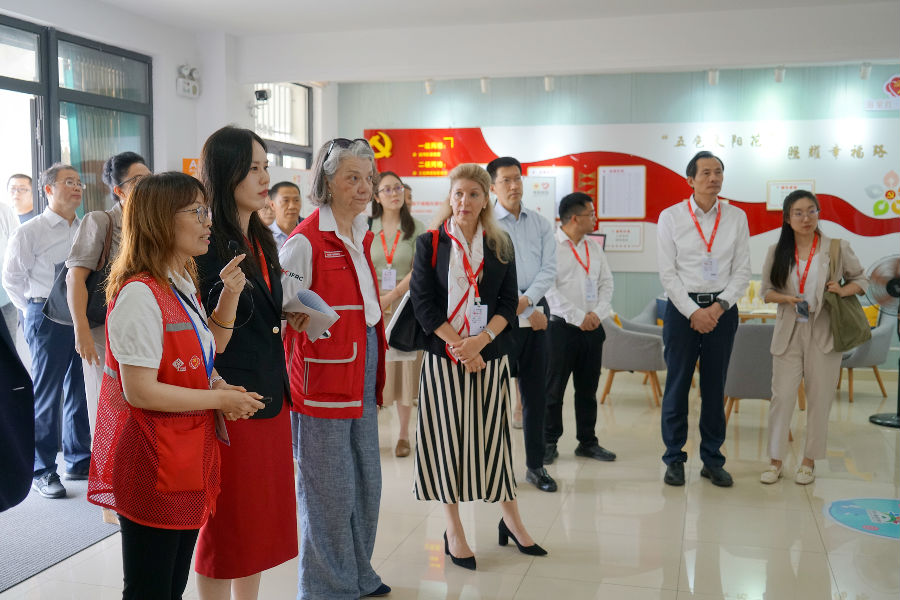凯特·福布斯首先来到位于姑苏区三元四村社区的红十字博爱家园,听取了博爱家园各服务阵地的功能介绍和工作成效,并现场体验了具有红十字特色的文创打卡,对社区在开展红十字志愿服务方面的多样性和创造性表示高度赞赏。