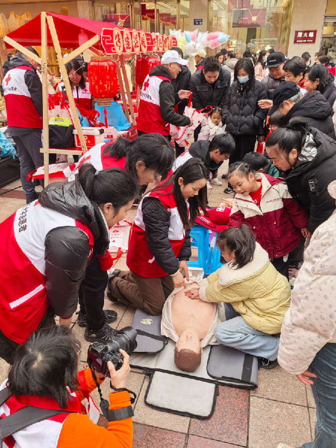 周围的市民们跟着志愿者一边念着“顺口溜”,一边跟着比划操练,通俗易懂、生动有趣的语言引得过往市民纷纷驻足观看,不少家长还带着孩子一起参与学习,大家纷纷表示:“这样的活动非常有意义,让我们在庆祝节日的同时,也能学到实用的救护技能,为家人的安全多了一份保障。”