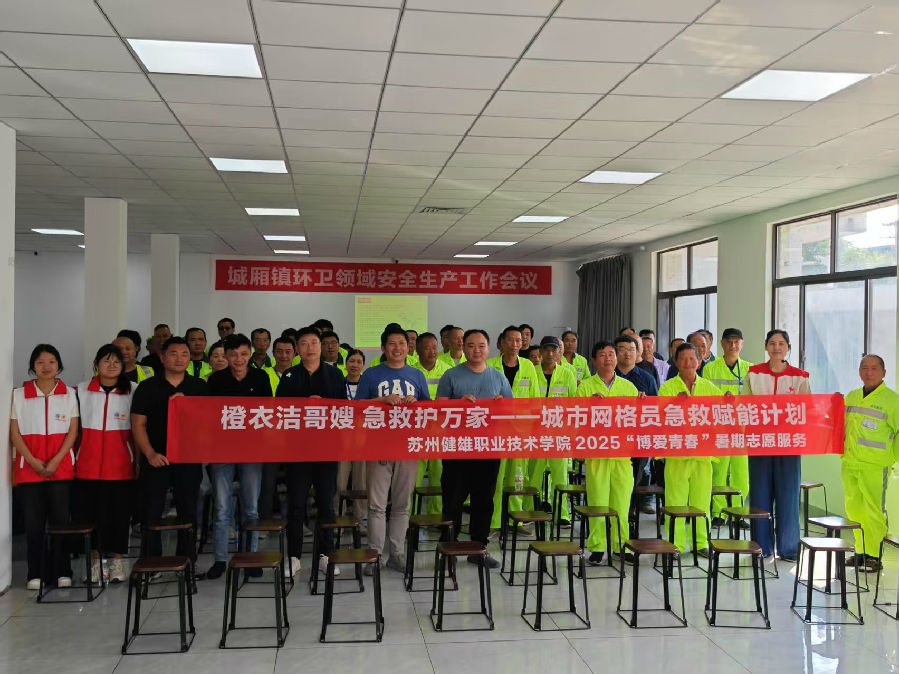 在城市基础设施飞速升级的当下,环卫工人早已化身活跃于街巷的“移动网格员”。他们每日穿梭在城市的各个角落,既是市容整洁的“隐形防线”,更是保障居民生命健康的重要力量。近日,苏州健雄职业技术学院生物医药学院的“橙衣洁哥嫂 急救护万家——城市网格员急救赋能计划”项目团队,走进太仓市城厢镇,为近200名环卫工人开展了三场专题应急救护培训。