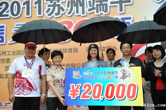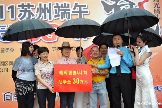 在此次活动举办期间,朝晖诚善A计划作为其中的一项衍生活动,为龙舟竞渡这一传统文化赛事注入了慈善的元素。获得龙舟赛男女组冠军的福建商会和由洋太太自组的尼盛万丽“海盗队”分别将获得的2万元奖金现场捐献给了我会。我会常务副会长严晓凤亲临现场,接受捐赠。同时,超威半导体技术(中国)有限公司总经理曾昭孔先生和著名主持人朝晖将“朝晖诚善A计划”募得的30万元善款也一起转赠给严会长。严会长向爱心企业表示了由衷的感谢并为各爱心企业代表颁发了荣誉证书,向来自苏州大学的贫困学生代表发放了爱心助学款。今年募得的善款将资助100名来自全国各地即将来苏就读的贫困家庭的大学新生。
