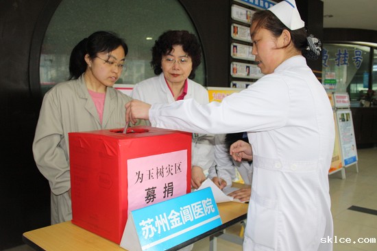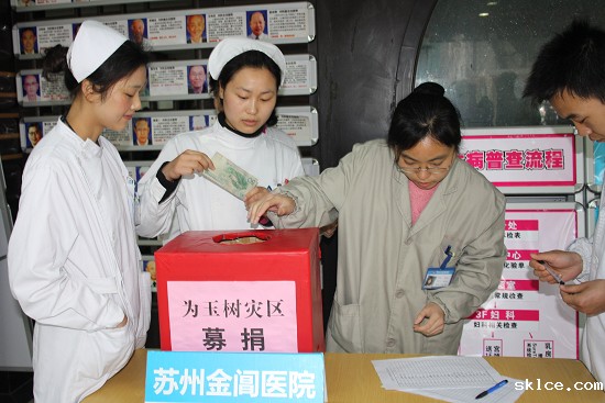 4月14日青海省玉树县发生7.1级强震,在大震面前金阊区卫生系统爱心涌动,纷纷为地震灾区群众捐款。4月16日,金阊区疾病预防保健中心在党支部的倡议下,全中心员工纷纷为灾区捐款,短短的半个小时就募得善款4500元,退休党员职工于建华专程到单位捐了100元,她朴实的说:“虽然钱少了点,但这是我的一片心意”。金阊医院全院员工也向灾区人民伸出了援助之手,医院党支部组织募捐活动,一天共募得善款11190元。医院董事长刘海涛先生闻讯后,也加入到捐款的队伍中,个人捐款100000元。目前,区卫生系统的爱心捐款活动还在进行中,大震有大爱,大家的爱心为灾区人民送去了温暖、送去了希望!