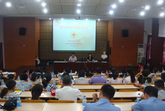 7月22日,吴中区西山农业园区(金庭镇)在西山中心小学多媒体报告厅举办了公益性应急救护培训班。参加培训的有中小学(幼儿园)、各村(社区)、旅游集团、派出所、交警、城管及镇机关单位的相关人员共86人。上午进行急救知识讲授,由金庭医院的孙丽萍老师和吴中人民医院周宏艺老师分别对救护新概念、心肺复苏、创伤救护、常见急诊及意外伤害知识进行培训;下午进行急救技术操作训练和考核,在培训师的指导下,参训人员分组练习心肺复苏等急救技术,最后进行理论和操作考核,经理论和操作考核合格后,获区红十字会颁发《初级救护培训合格证》。