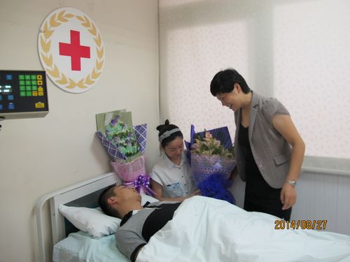 谢健在五天前来到了苏大附一院广慈分院进行造血干细胞的准备,但是入院前一天由于工作过于疲惫出现了感冒、发热、乏力的症状,谢健怕发热不能准时捐献又担心用药影响捐献质量,整个晚上不停地物理降温,喝大量的水,心理和身体都非常的辛苦。入院后通过消炎挂水治疗,谢健的烧退了,人也精神了,他感慨地说:我发着烧一想到对方在病床上等着我去救,我就非常的着急,恨自己身体怎么这么不争气这么巧发了烧,还好最后顺顺利利。在入院动员的这几天里,爱人小赵除了要照顾发烧的谢健,最让她牵挂的就是十个月的儿子了,小赵一提起儿子就感觉有点心酸,儿子出生到现在还没有和她分开过,但是一想到谢健需要她去照顾,有个花样少年等着她的爱人的造血干细胞去救命,小赵就只能把心爱的儿子放一放,全心全力地照顾丈夫。