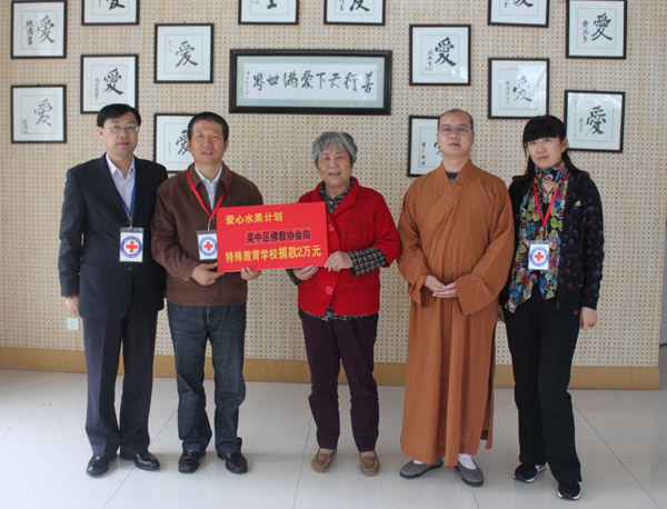 10月29日上午,经吴中区红十字会牵线搭桥,区佛教协会陈副会长一行冒雨来到特殊教育学校,现场捐款2万元,为残疾儿童奉献爱心。