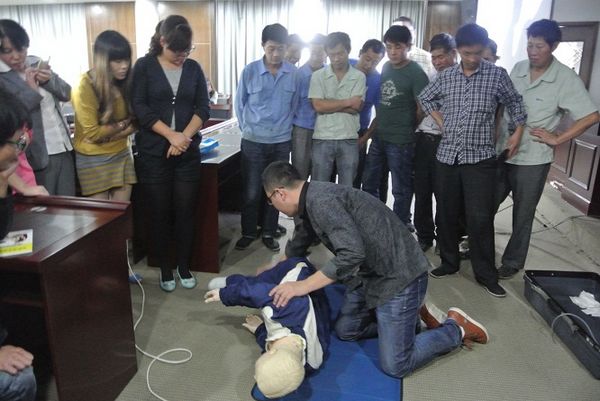 培训师按照救护培训大纲内容,重点讲解了成人现场徒手心肺复苏术、呼吸道异物阻塞急救办法,以及外伤的止血、包扎与搬运等,并为每位参加培训人员发放了《市民安全救护手册》。