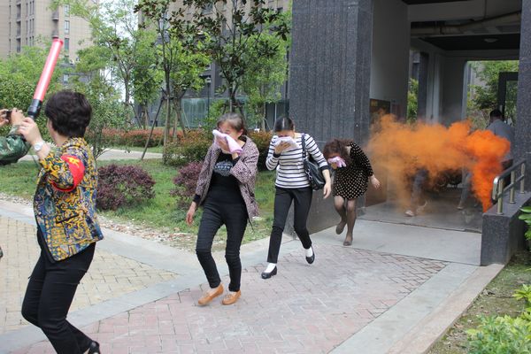 随着“开始”一声令下,小区内拉起了警报,四处开始弥漫起黄色的浓烟,由各小队的队长引领,居民们一个个迅速的用毛巾捂着口鼻,猫着腰从居民楼中跑出,有序撤离到空旷的中心广场上。