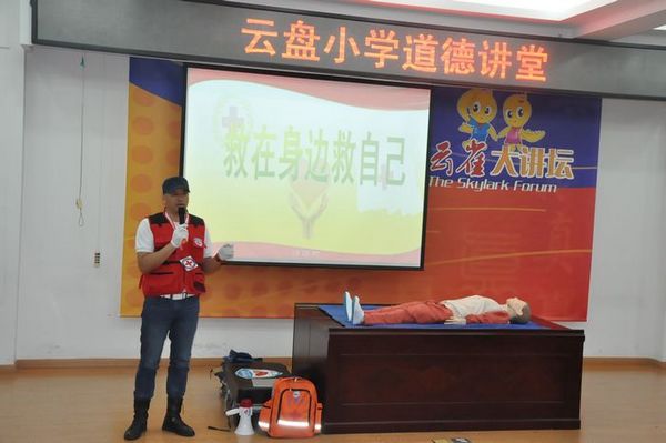 云盘小学还邀请了市红十字应急救援志愿服务队副队长陈伟对全校教师进行了一次心肺复苏急救知识培训,让老师们不出校园就能够接受专业急救知识技能培训。