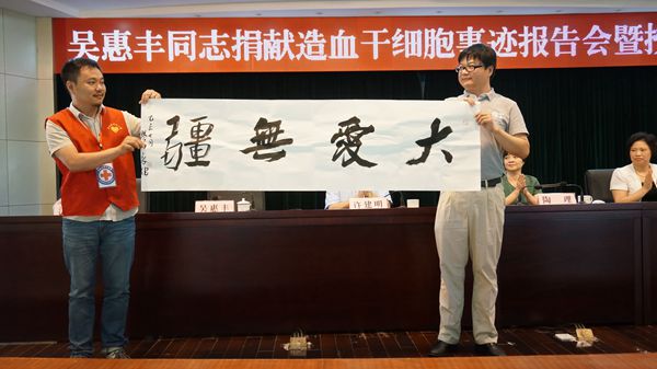 吴惠丰现任古里镇纪检监察室主任,今年7月28日,他在苏大附一院捐献了120毫升造血干细胞悬液,给一名患有白血病的三岁小朋友送去了生命的希望,成为全国第5081位、全省纪检监察系统第1位、苏州市第101位、常熟市第10位造血干细胞捐献志愿者。与会人员观看了吴惠丰同志捐献造血干细胞电视片,聆听了吴惠丰个人事迹报告。吴惠丰同志关爱生命、无私奉献的精神向社会传递出一股温暖人心的正能量,引起了广泛的社会反响。古里镇青年志愿者代表上台发言,表示要向吴惠丰同志学习,不仅要唱响博爱奉献精神,更要身体力行、模范践行,为古里的发展、为实现中华民族伟大复兴的中国梦,凝聚更多青春力量。常熟市红十字会理事单位虞城大酒店、市红十字会协作社团流水琴川义工团分别向吴惠丰赠送了纪念品和书法作品。