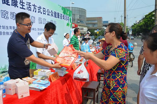 2015年9月1日是我国第9个全民健康生活方式日。当天上午,吴江区红十字会联合区卫计委、健教所、疾控中心等单位组成宣传活动小组,在盛泽镇衡悦广场开展公众健康咨询活动。