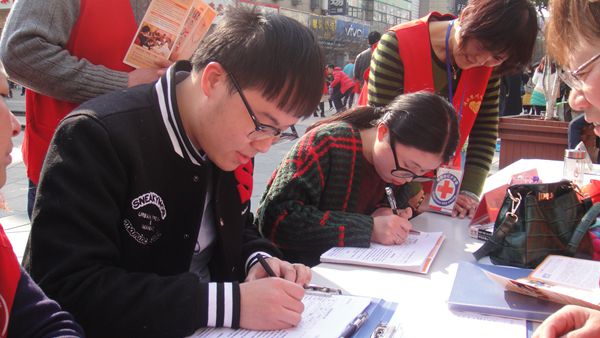 当天的方塔东街步行街阳光明媚,人来人往,充满了节日的喜庆气氛。红十字志愿者们放弃和家人相聚的机会,在爱心献血屋前摆开宣传台,向行人宣传劝捐造血干细胞。在劝捐的红十字志愿者队伍里,来自常熟轴承有限公司的宗益在2013年加入中华骨髓库,去年10月,她通过了高分辨配型,由于患者病情不稳定,一直没有机会捐献。宗益盼望今年对方病情能够好转起来。宗益的事迹感动了身边的人,她的同事姚子佳和女友特地赶到现场报名,一些行人听了宗益的亲身经历,由此萌发了加入爱心奉献行列的意愿,为白血病患者提供再生的希望。
