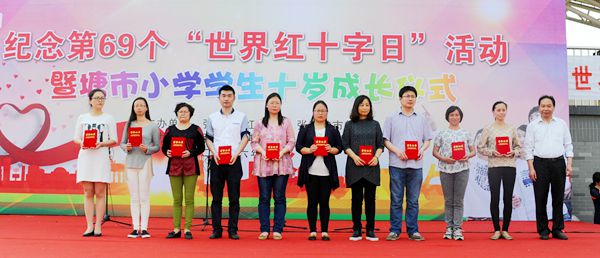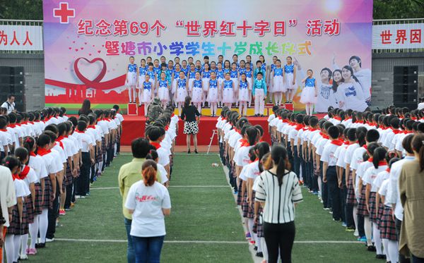 5月6日下午,在张家港市塘市小学操场,市红十字会和市教育局联合举办纪念第69个世界红十字日活动暨塘市小学学生十岁成长仪式,拉开了张家港市2016年红十字“博爱周”的帷幕。塘市小学4~6年级学生及四年级学生家长、2015年度学校优秀红十字工作者和优秀红十字青少年、江苏省及苏州市红十字示范学校常务副会长及秘书长等约2000人参加活动,张家港市教育局副局长马丽忠、市红十字会副会长蔡贤出席活动。