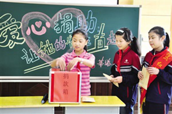 5月24日下午,芦墟实验小学的红十字会员们将一份份爱心捐款投入捐款箱,为救治患特发性脊柱侧弯的新疆女孩阿比旦。