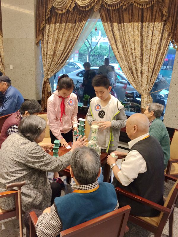 阵阵欢声笑语不时从苏信女儿家养老院传出来。今天是国际儿童节,苏州市平直实验小学的红十字青少年们在老师的带领下来到养老院,“40”后的老人们和“00”后的孩子们一起过“六一”。
