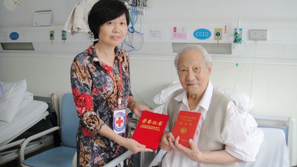 近日,常熟市红十字会常务副会长顾丽华看望慰问了常熟市“五乐老人”、年逾九旬的离休干部胡蔚然先生,向他颁发了遗体捐献荣誉证和纪念证,并祝他安享晚年,长命百岁。