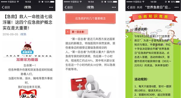 为进一步宣传普及应急救护知识,倡导“人人学急救,急救为人人”的理念,在第17个“世界急救日”前后,常熟市红十字会联合常熟市委宣传部,通过“i常熟”、“八点电视吧”等微信公众号开展了“世界急救日”应急救护知识有奖竞答活动。