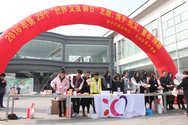 12月1日上午,吴中区红十字会联合区疾控中心在苏州工艺美术职业技术学院开展主题为“携手抗艾,重在预防”的艾滋病知识宣传活动。