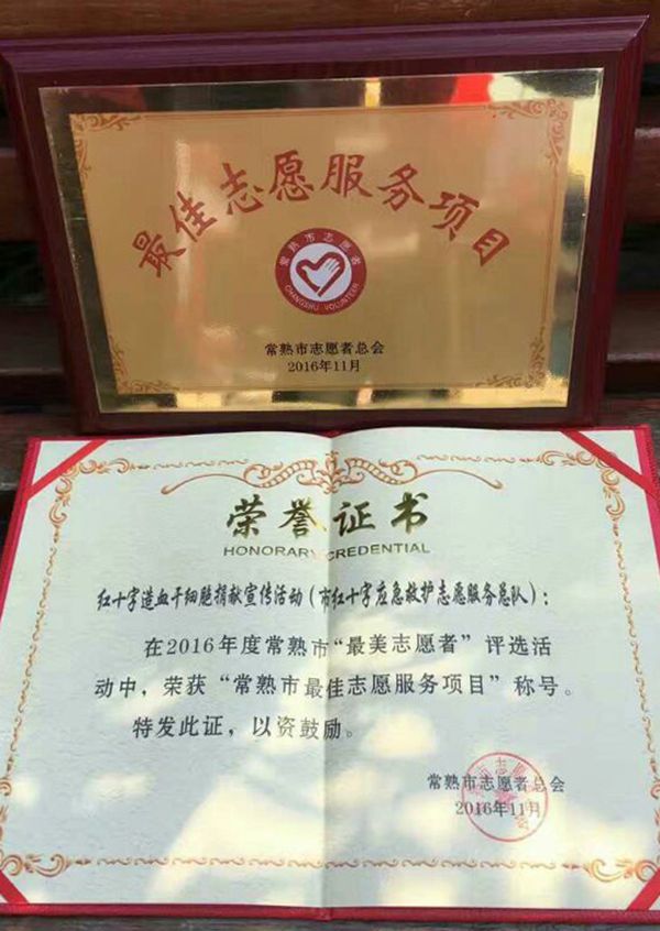 3月3日,在常熟市第十二届志愿服务月启动仪式上,常熟市红十字会与常熟市流水琴川义工协会合力打造的造血干细胞劝捐宣传志愿服务被常熟市志愿者总会表彰为2016年度“最佳志愿服务项目”。