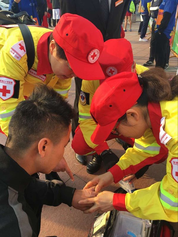 活动现场,救护师们给参赛人员提供了完善的后勤保障,积极救助意外受伤的选手。主会场有市民手指弄破出血,红十字救护师立即为其消毒后贴上创可贴避免感染;在第一个补给点,有市民脚扭伤,在现场的陈亚救护师立刻给予其冰袋冷敷,之后由救护车送往医院进一步处理。张家港市红十字会应急救援队圆满完成了赛事的应急救援保障,获得了主办方和选手的一致好评。