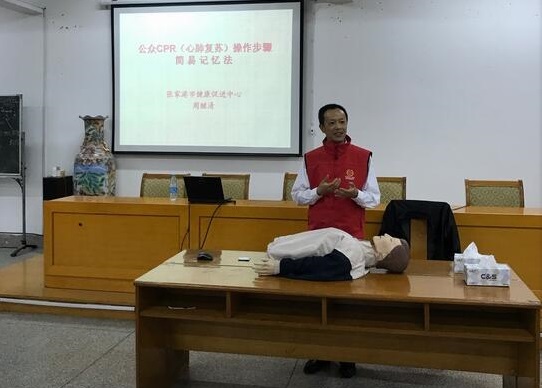 周书记首先阐述了掌握“应急救护之心肺复苏术(CPR)”的重大意义。接着介绍了为帮助大家快速掌握CPR操作步骤,由他自己在实践研究中发明的CPR操作步骤一句话“顺口溜“:角叫鸭(1叫2叫3压4开5口说话了)。周书记边讲解,边演示,向大家详细介绍了上述五步急救法每一步的操作原则、方法及注意事项。
