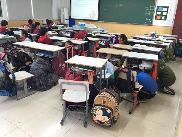 9:10-9:15,各班班主任在教室讲解逃生要点并进行分解动作练习。9:15,随着警报拉响,全体学生就地避险,他们用书本等物体护住头部,蹲在课桌旁边。第一波震过去,撤离信号发出,正、副班主任老师分别指挥两组同学迅速、有序地撤离到操场。