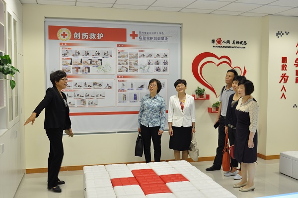 考察人员重点参观了吴江红会的省级应急救护培训基地,包括理论教学室、操作训练室、师资备课室等。随后进行了交流座谈,吴江区红十字会常务副会长沈小红向大家介绍了吴江区红十字会的组织建设情况、省级救护培训基地建设成果和其他红十字核心业务开展情况。