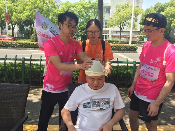 挑战赛当天,活动现场红十字志愿者在摊位上发放资料和环保袋宣传红十字精神,比赛体育线和旅游线的任务点上设置了红十字任务--三角巾头部帽式包扎。4位红十字志愿者作为任务裁判分成两组负责两条线路,当参赛选手到达任务点时,由志愿者演示一遍包扎,后由两名选手合作完成,经过评定合格后发放通关卡,选手才能继续前进完成下一个任务。历时3个多小时的比赛后,选手完成挑战,通过城市坐标定向赛的形式,呼吁市民加入文明行动,也宣传了红十字精神。