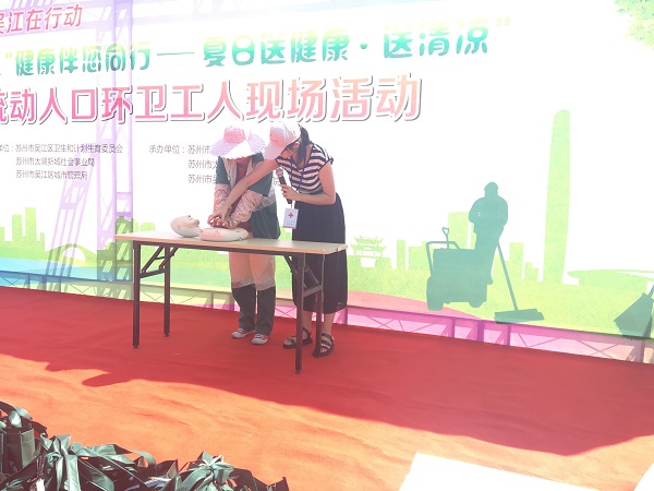 活动现场,区红十字工作人员利用半身模型演示操作,向环卫工人们详细讲解心肺复苏术的具体步骤,不少环卫工人主动上前尝试了心肺复苏操作。