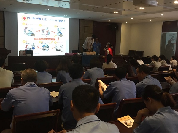 讲座中红十字志愿者包老师从高温中暑的原因、症状、处理和心肺复苏等方面详细讲解,并要求办公室人员、一线工人、保安等各个条线人员进行现场实际操作示范,给予指导,员工们积极参加,现场气氛十分活跃。