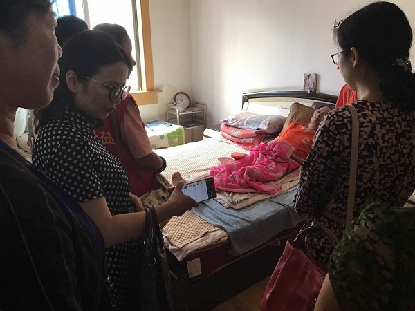 之后,志愿服务队员们又来到城厢社区,走入病卧在床的罗瑞林家中。罗瑞林患有哮喘,还有脑出血的症状,病情十分严重。虽然大家无法在现场为其提供专业治疗,但还是带来了物质上的慰问,并给其家属提供了很多建议。大家希望病人能尽早回到医院接受专业护理,同时用手术来解决脑出血病症。病人的家属听后很是感动,并表示会考虑建议。