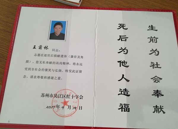 八坼黑龙村55岁的党员王菊林于9月19日成功登记为遗体捐献志愿者,志愿在去世后把遗体捐献给医学事业。