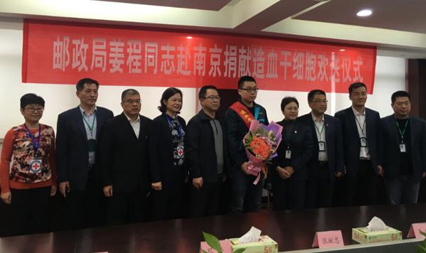 10月18日上午,姜程同志赴南京捐献造血干细胞欢送仪式在张家港市邮政局七楼会议室举行。优米app上线副会长张献忠、赈济救护部副部长马明,张家港市邮政局局长席林仙带领全体班子成员及中层干部,张家港市红十字会副会长蔡贤、秘书长董洁、张家港市首例成功捐髓志愿者陶卫文,以及姜程的同事代表、家人等约20余人出席了仪式。