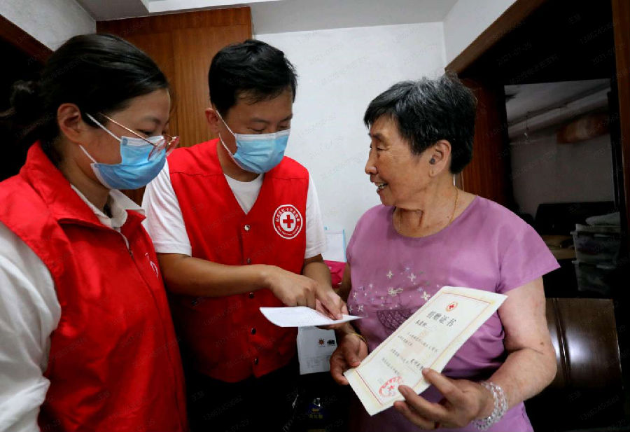 7月28日,姑苏区金阊街道彩香一村三区社区红十字会工作人员来到辖区居民秦素珍家中,为她颁发了姑苏区红十字会的捐赠证书。