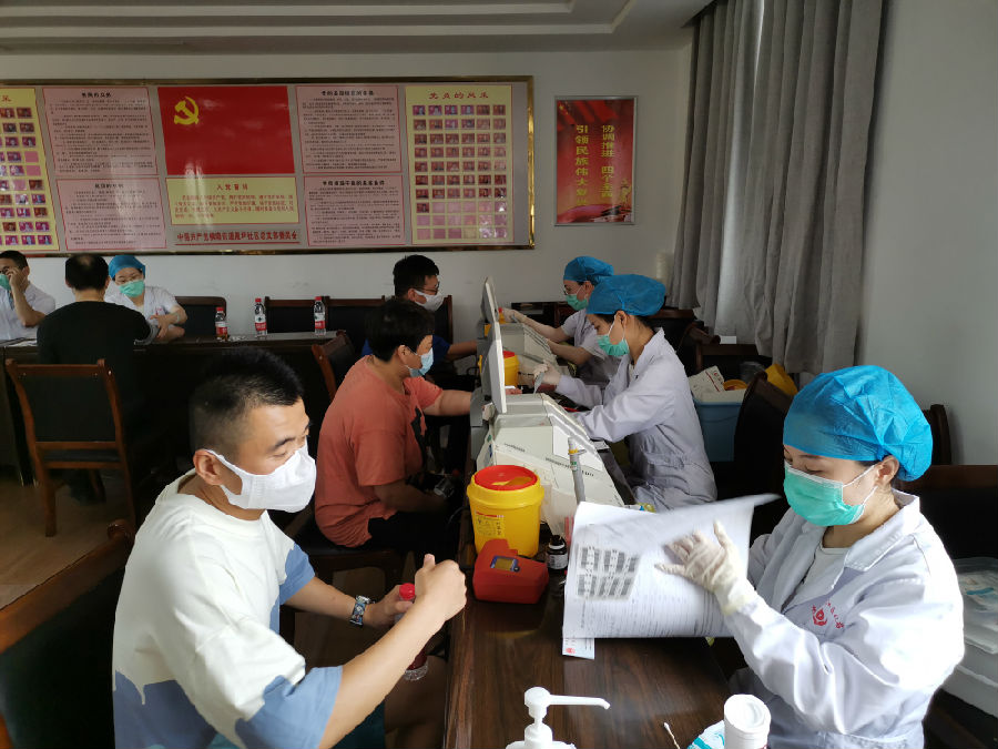 来自横扇街道红十字会的志愿者早早来到社区,分好工后在不同的场所就位。有的为献血志愿者检查苏康码、行程码等,有的协助填写《献血体检登记表》,有的讲解献血流程。