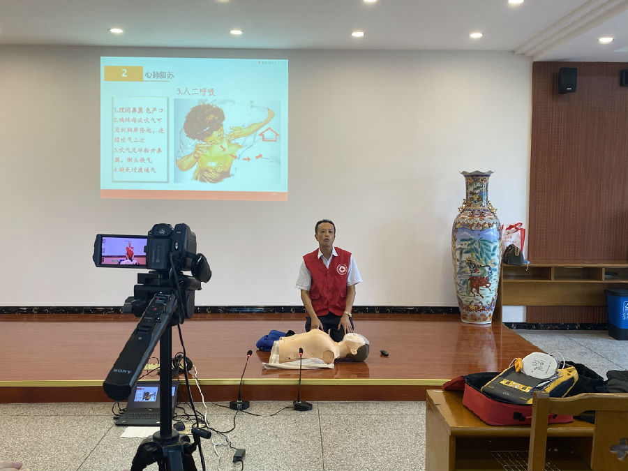 课程录制中,救护师将理论与实操相结合,通过讲解、现场操作等直观形式,普及了心肺复苏、AED使用的方式方法,使大家对救护知识有系统而全面的了解。此外,还穿插了红十字“三救三献”知识的宣讲,红十字工作人员通过图文并茂的方式向大家介绍了无偿献血和造血干细胞的相关知识,旨在消除大家对献血、捐献造血干细胞的疑虑,使更多人自愿加入到捐献行列。