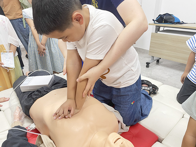 首先,两位培训师通过讲述身边的真实事件,向大家介绍了学习应急救护知识、提高自救互救技能的重要性和必要性。接着,老师围绕心肺复苏、气道梗阻两方面进行教学,并细致地进行现场实操教学。孩子们认真地听讲,不时向老师提出疑惑,积极地进行亲身实践,老师也耐心地纠正、指导,并给予鼓励和赞赏。