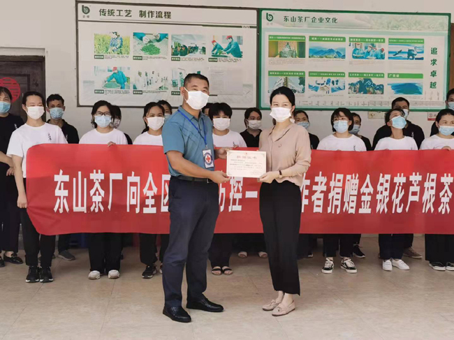 东山茶厂创办于1953年,是一家专业生产各类茶的江苏省农业产业化重点龙头企业,也是江苏省的老字号企业,主要产品为碧螺春茶、碧螺红茶、茉莉花茶和桂花红茶等。今年8月,江苏多地发生疫情后,社区工作人员和医护人员奋战在防疫一线,有不少人因闷热导致中暑晕倒。为了帮助防疫工作人员防暑降温,公司近期特别定制了这款金银花芦根茶,捐赠给吴中区奋战在疫情防控一线的工作人员,让他们更好地开展疫情防控工作。
