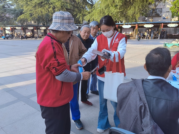 活动现场悬挂宣传横幅,为居民发放骨质疏松知多少、中老年人健康保健十六要诀、体质指数知多少、老年健康核心信息、急救小知识等宣传资料。现场还邀请了红十字志愿者进行健康义诊,为市民提供健康知识问答、免费测血糖和量血压等服务。