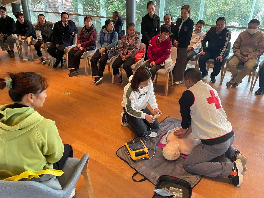 此次培训分为理论教学和实践操作两个部分。姑苏区红十字救护培训师花培钦首先向大家讲解了心肺复苏术和海姆立克急救手法,并现场演示了心肺复苏术、人工呼吸和海姆立克急救法等理论知识。在实际操作中,花老师强调首先要确认现场安全和自身安全,尽快确认伤者和患者情况,及时拨打120,再拨打110,用正确的方法对伤者进行救护。