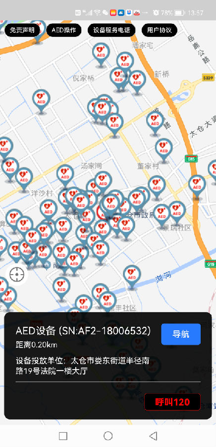 该导航软件通过链接“百度”、“高德”、“腾讯”、“苹果”四款地图,搜索AED信号进行定位,改变了同类软件以设备物理配置点定位的模式,进一步提高了定位精度,减少了区域内AED搜寻时间,实现了太仓市180台“救助站”的联网统管。