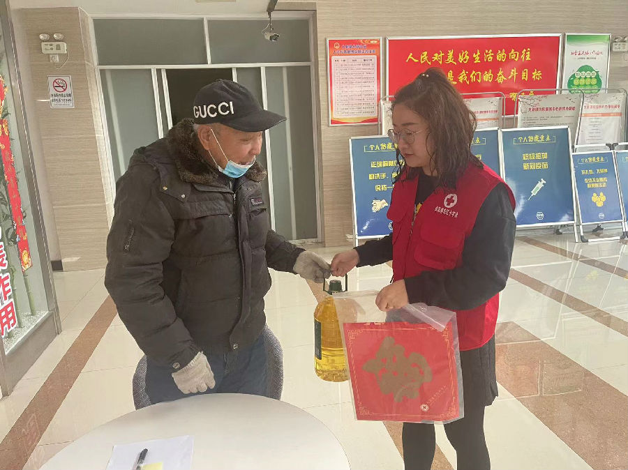 住在新闸村的祁大爷,家庭条件十分困难,两个老人退休在家没有经济收入,祁大爷又患有多种慢性疾病,需要长期吃药且药费比较昂贵。镇红十字会了解到他们的实际情况后,组织红十字志愿者为他们送上600元慰问金、食用油和一对春联,提前为他们送上春节的祝福。同时叮嘱他们疫情期间外出要做好个人防护,过一个平安、祥和的春节。