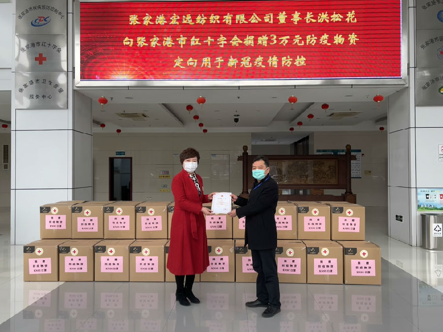 2月21日下午,张家港宏远纺织有限公司向市红十字会捐赠5万只KN95口罩,用于疫情防控。