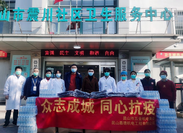2月25日下午,昆山市五金机电商会、昆山嘉德机电工程有限公司、苏州鑫晟香酒业有限公司通过昆山市红十字会,向昆山市震川社区卫生服务中心捐赠150个双肩包、100箱矿泉水等物资。