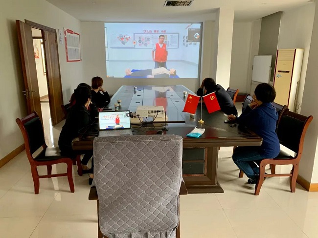 红十字救护培训师通过视频的方式,向参与培训人员教授理论急救知识和心肺复苏术等实际操作演示。