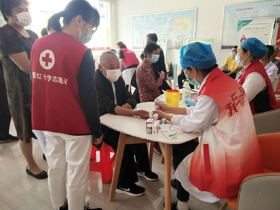 活动当天,在晨阳社区一楼大厅内,计生特扶对象有序排队测血糖、量血压,社区医生们询问病史,详细讲解高血压、高血糖的预防措施、注意事项。