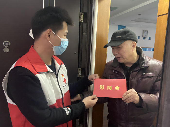 在清塘社区的双残困难家庭金阿姨家,红十字志愿者向金阿姨详细了解生活状况和身体情况,得知她与儿子两人相依为命,母子二人均为肢残且无固定收入后,志愿者给她加油打气,鼓励她保持积极向上的心态,并送上棉被和慰问金。金阿姨激动地说:“感谢你们来看望我们孤儿寡母,感谢政府、感谢红十字会的关怀。”