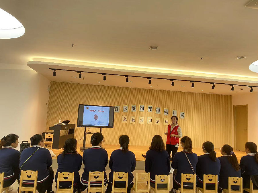 4月11日,苏州市吴江区红十字会救护培训师包亚娟为滨湖绿郡幼儿园的全体教职工进行急救培训。